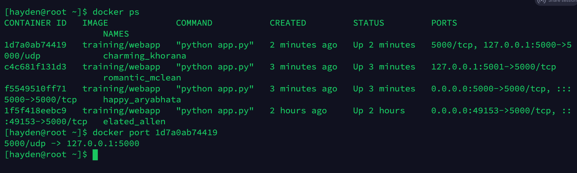 - unless-stopped:在容器退出时总是重启容器,但是不考虑在Docker守护进程启动时就已经停止了的容器