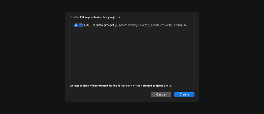 创建名为 GitHubDemo 的项目作为演示(这里没有勾选 Create Git repository on my Mac