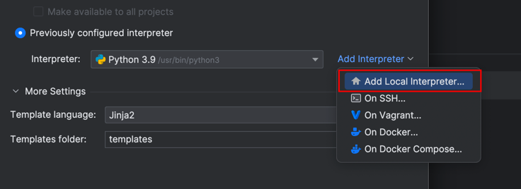首次添加虚拟环境时,需要在 Proviously configured interpreter