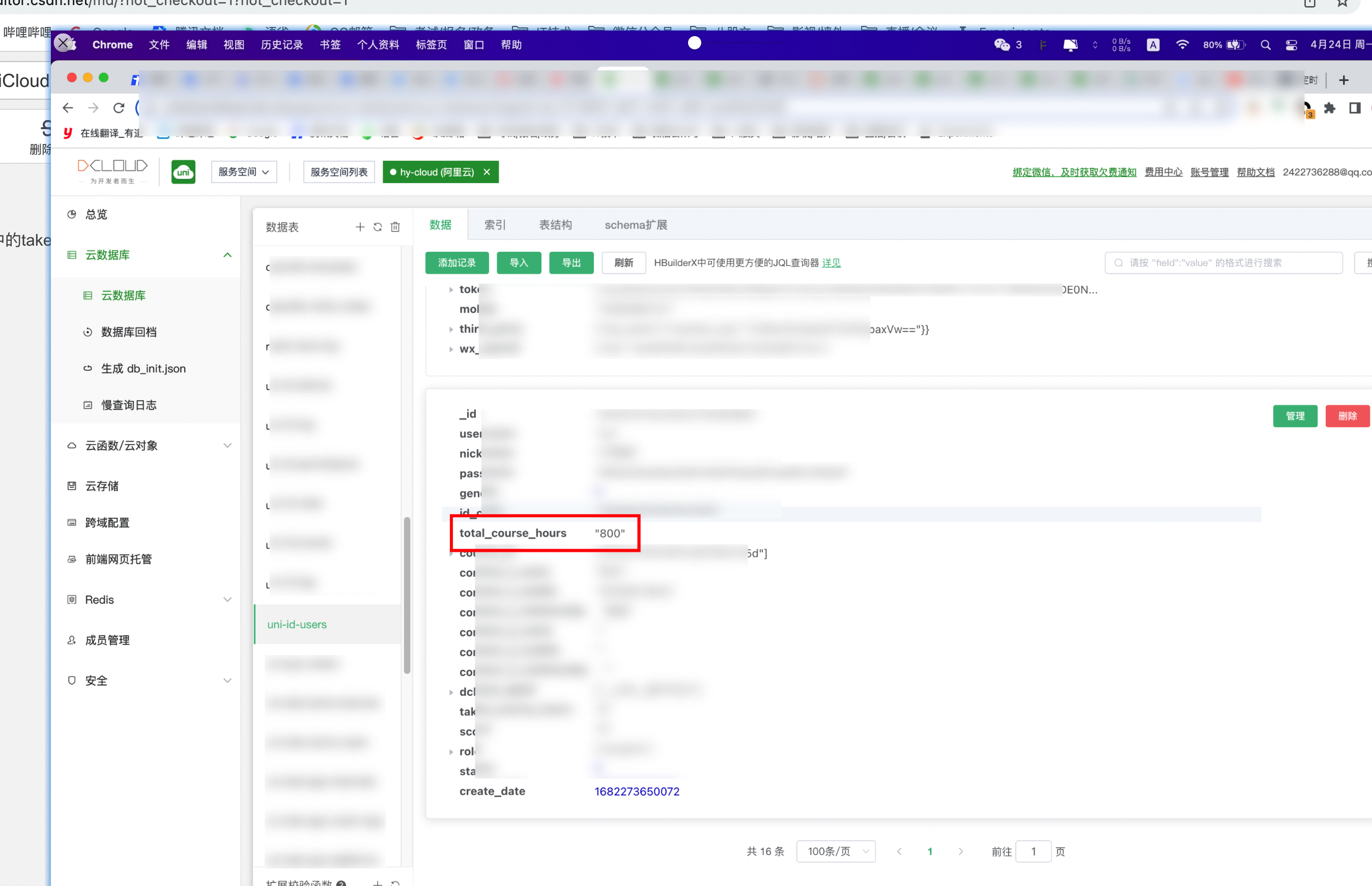 在 uniCloud Web 控制台中,默认已添加的数据中是不允许删除字段操作的,例如下图的只删除框中的 taken_course_hours 字段: