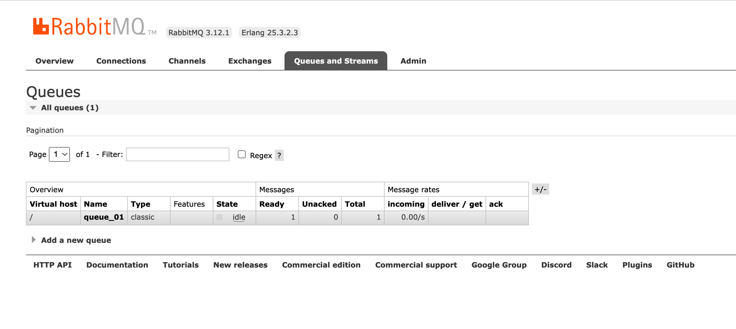 在 Web 控制台可以看到消费者已经消费了队列上的消息: