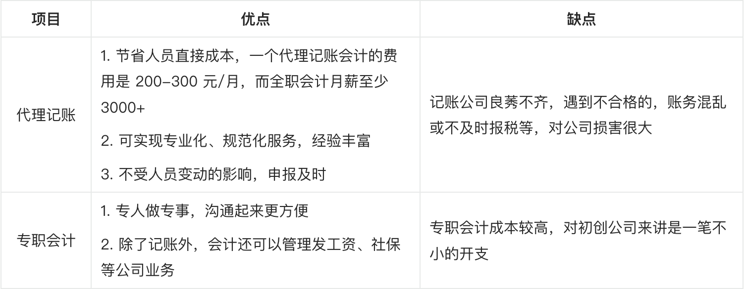 第⼀种是招聘⼀名专职会计,由会计来负责记账;另⼀种是找⼀个代理记账的公司或个⼈,将记账业务外包给他们。下⾯我们⽐较⼀下各⾃的利弊,⽅便创业者选择适合⾃⼰公司的记账⽅式。