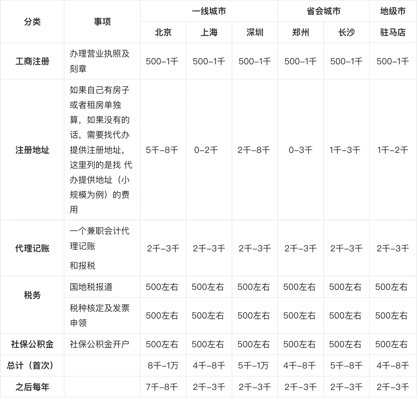 | 代理记账 | 会提供一些代理记账的服务 | 需要自己记账或外包,孵化器和集中办公区也有代理记账服务,但是需要每年续费 |