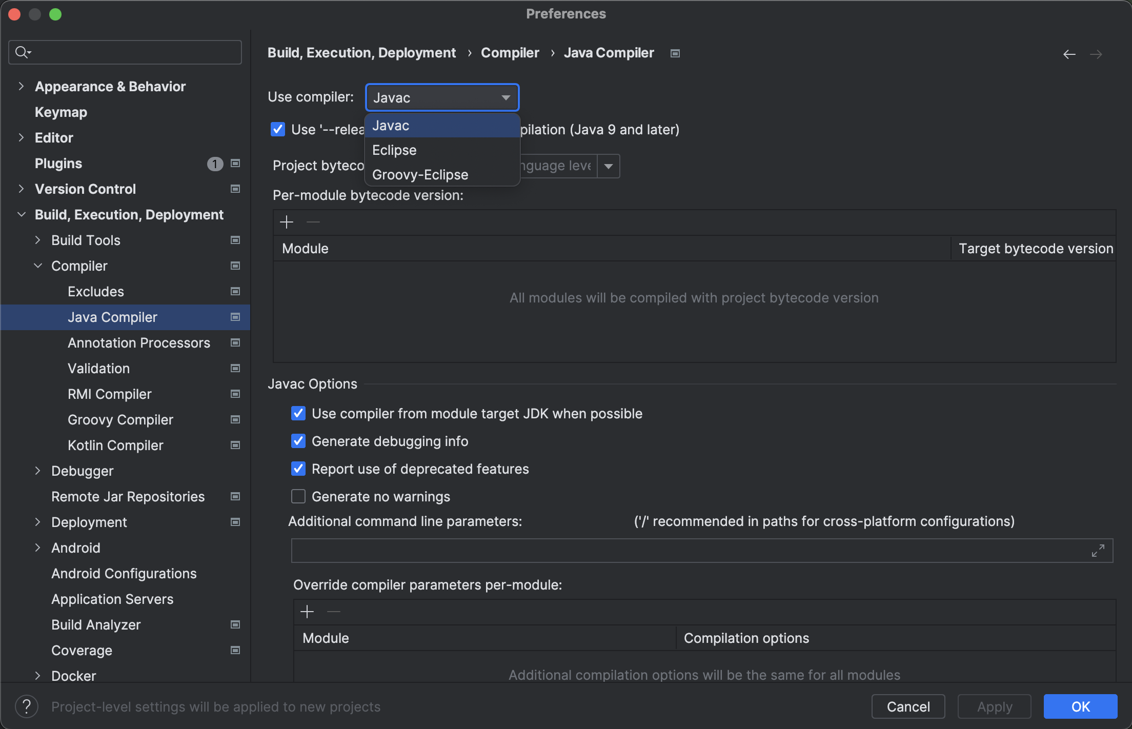 因为要进行与 Java 相关的开发,Use Compiler 需要选择 Javac 编译器。除了 Javac 以外,还有其他类型的编译器。