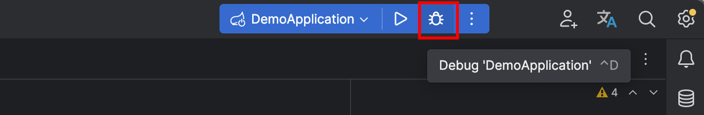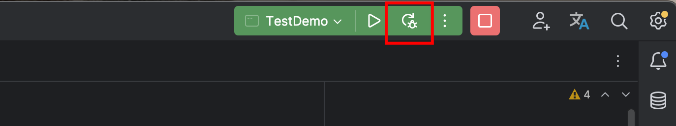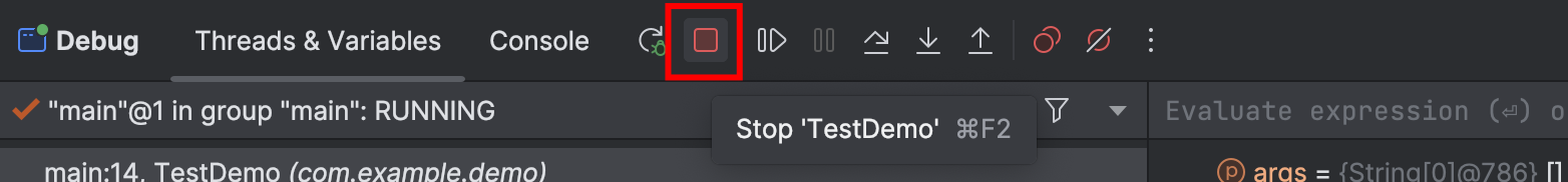 - 按钮“Debug”是 Debug 模式的启动按钮,在程序停止后可再次单击此按钮启动 Debug 模式运行。在启动之后会变为“Restart Debug”按钮,单击此按钮后程序会自动跳过所有的断点重新运行并且在第一个遇到的断点处阻塞。