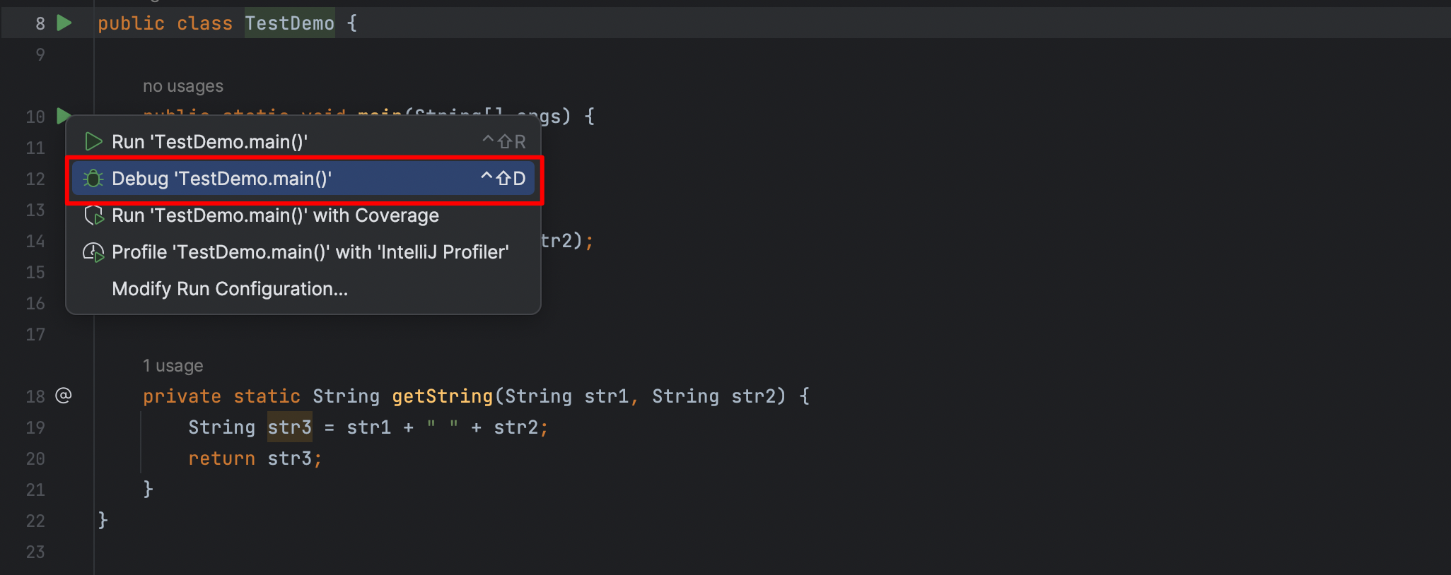 在进行单元测试时,Debug 模式可由工具栏上的“小虫”图标按钮启动触发,也可以在快速启动或右击菜单中选择 Debug 命令运行。