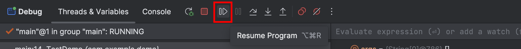 - 按钮“Resume Program”是 Debug 模式的恢复按钮,单击此按钮后程序将从中断状态恢复并继续向下执行直至遇到下一个断点或运行结束,它可以跳过当前断点。