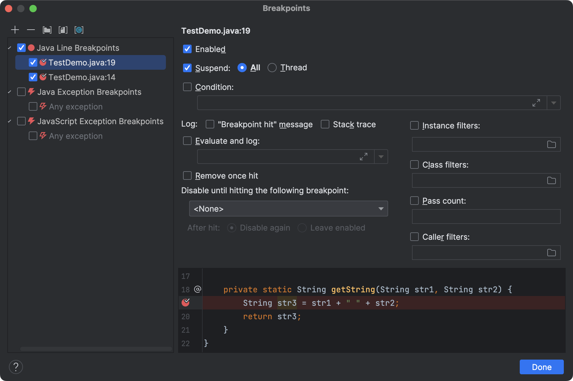 也可以右击任意的断点,点击“More”(快捷键为 Shift + Cmd + F8)来打开查看所有断点窗口。
