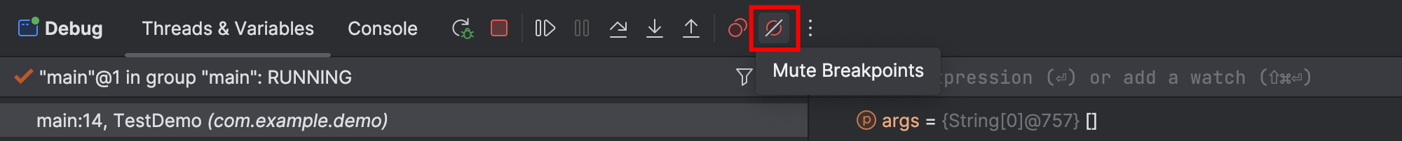 - 按钮“Mute Breakpoint”用于对断点执行静音操作,单击后会使所有未执行的断点在当前运行环境中失效,从而让程序快速执行到最后,当再次运行调试时所有断点将会再次生效。