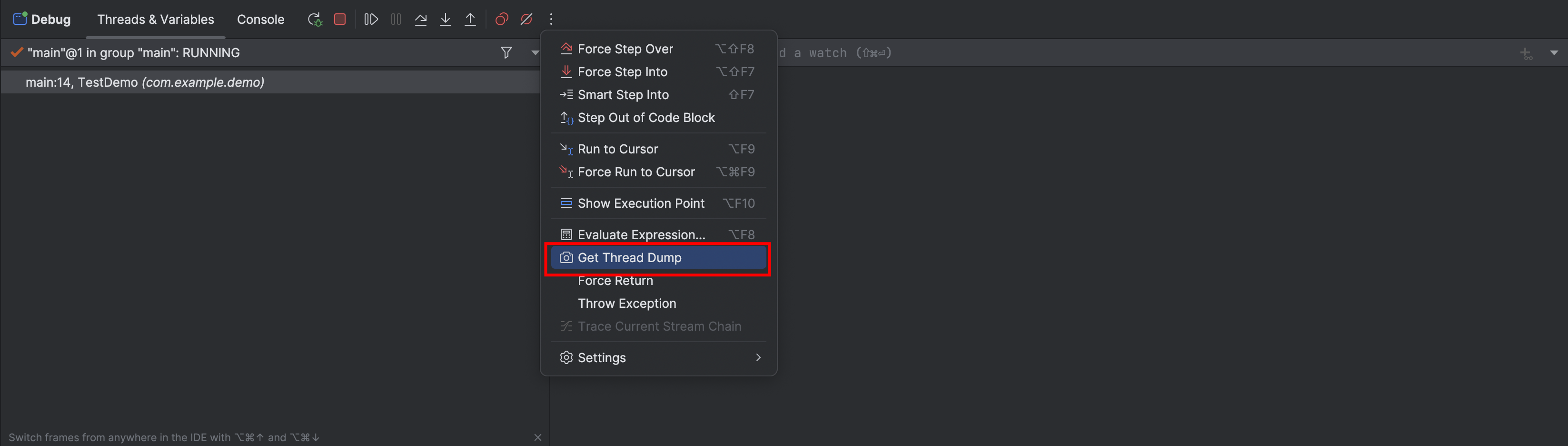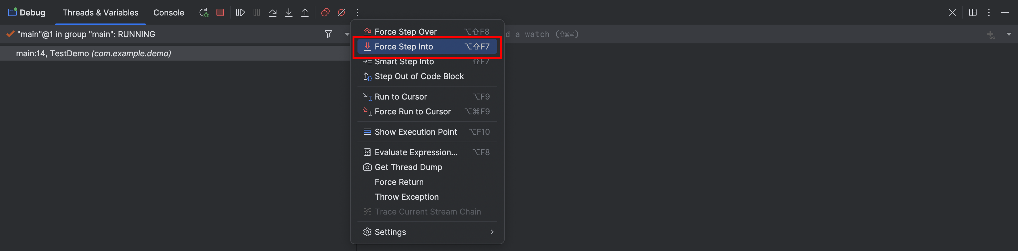 强制步入与步入一致,且其图标为红色。当调试步骤执行到某一行时可以强制进入任何方法,此操作对于调试框架底层源码或官方类库十分有用,也是对步入功能的补充。