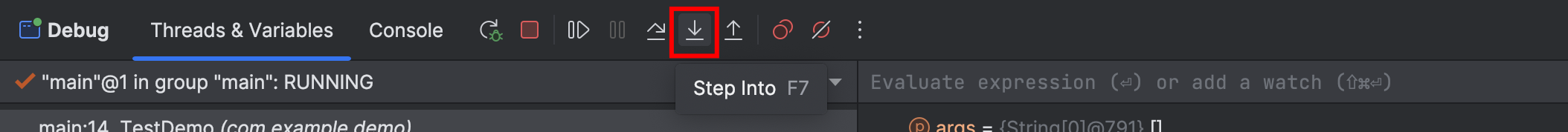 单击此按钮可以将调试过程逐行向下执行,如果某行上有方法调用,则不会进入方法内部。