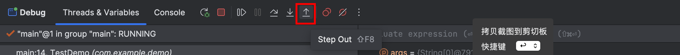 当执行步出操作时会将步入操作的方法执行完毕,然后退出到方法调用处,只是还没有完成赋值。