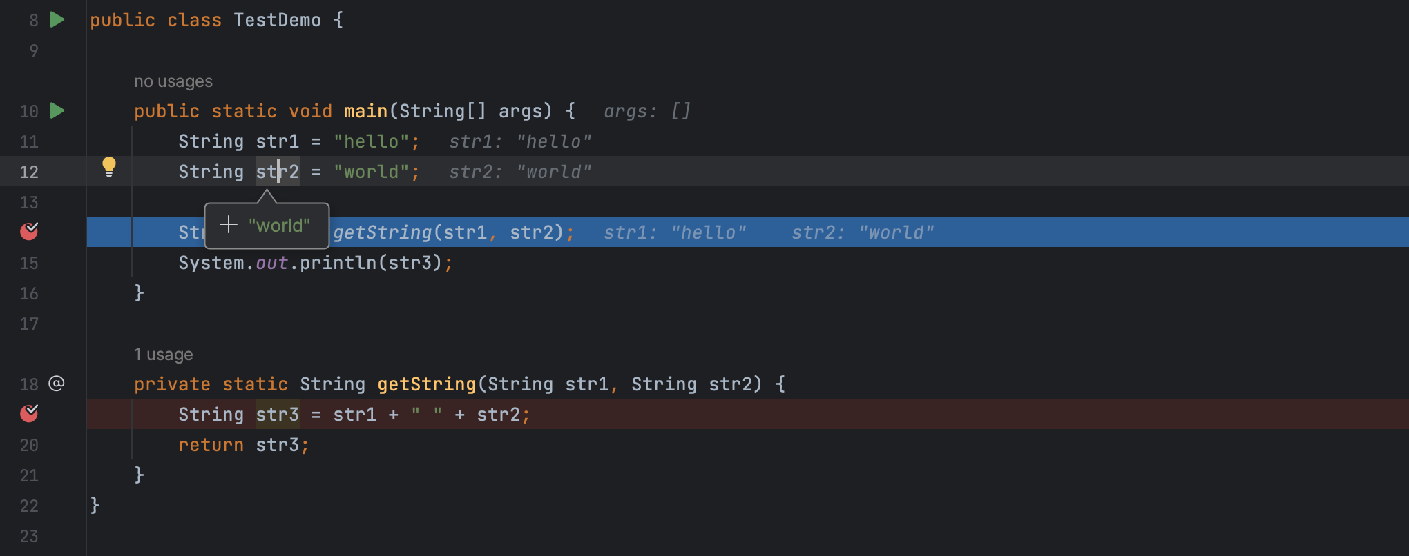 如果需要观察某些参数的变化,则可以将光标悬停在参数上,此时 IntelliJ IDEA 也会显示当前变量(或对象)的信息。