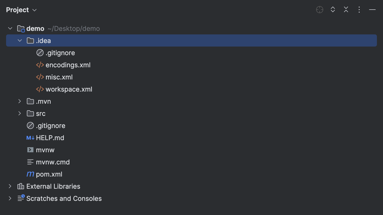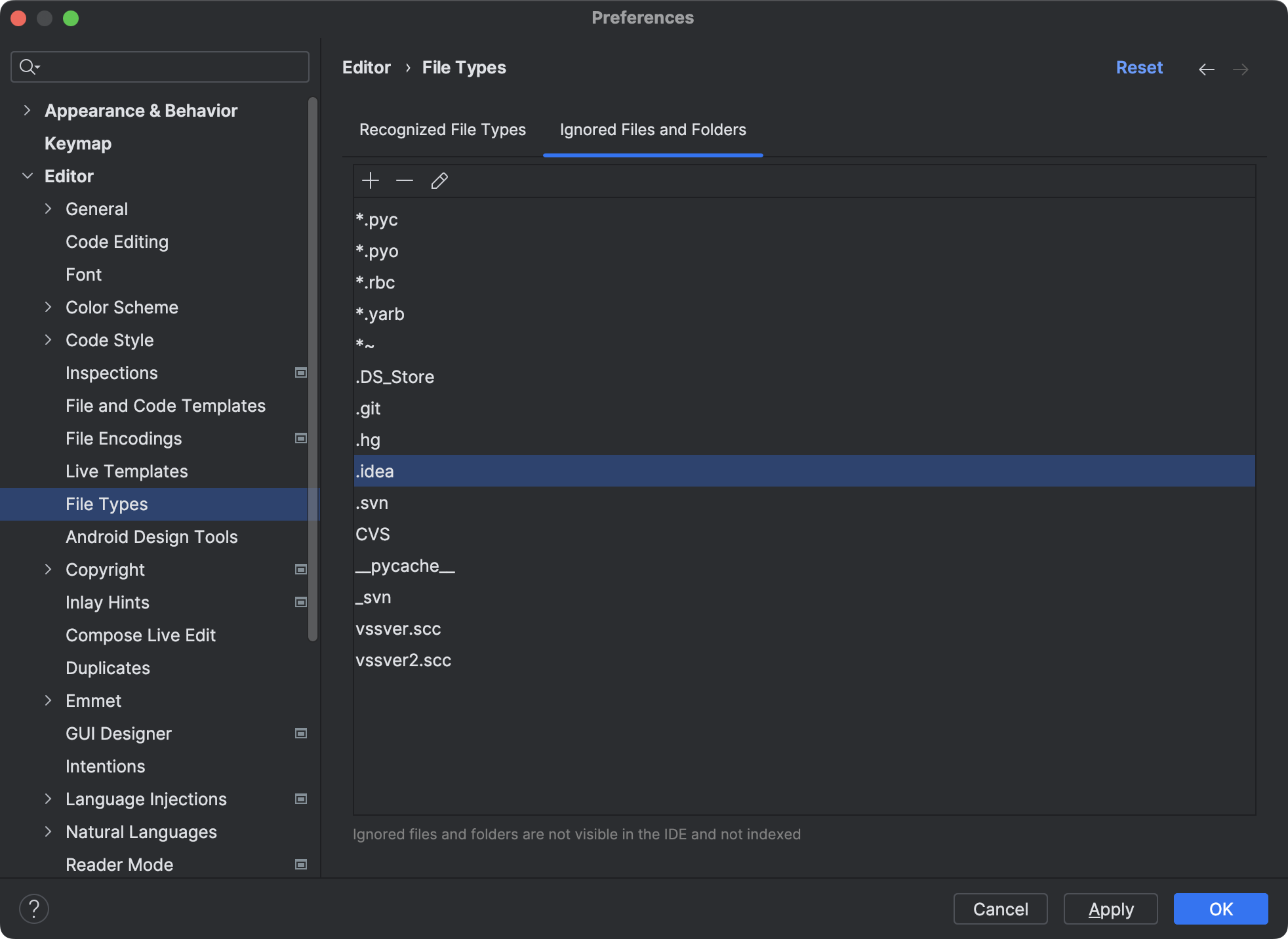 当然,也可以将 .idea 目录隐藏起来。执行菜单 Preferences 打开配置窗口,找到 Editor 选项卡下的 File Types 设置,在右侧的 Ignore Files and Folders 中添加 .idea 目录标识即可实现隐藏。