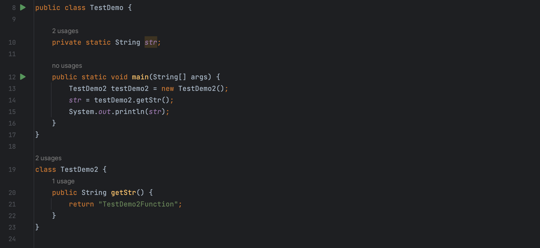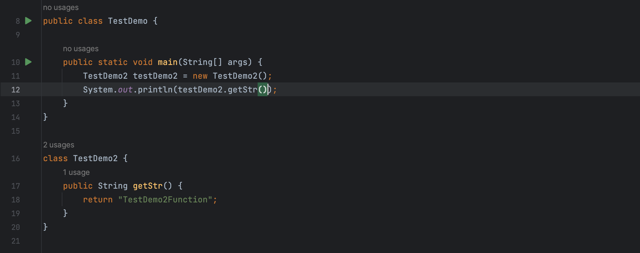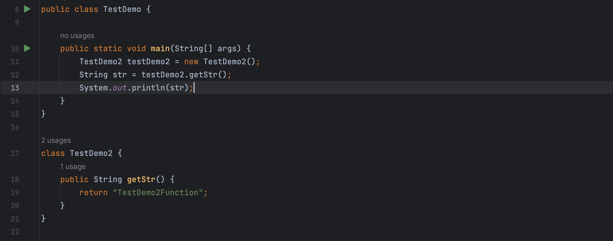 例如在 TestDemo 类的 main 方法里调用了 TestDemo2 的 getStr 方法同时打印输出。