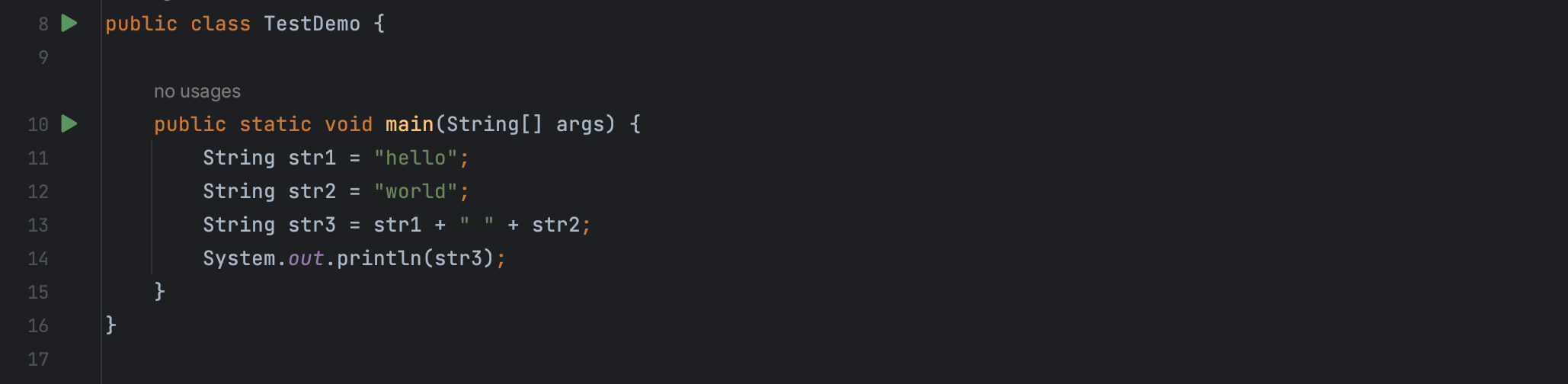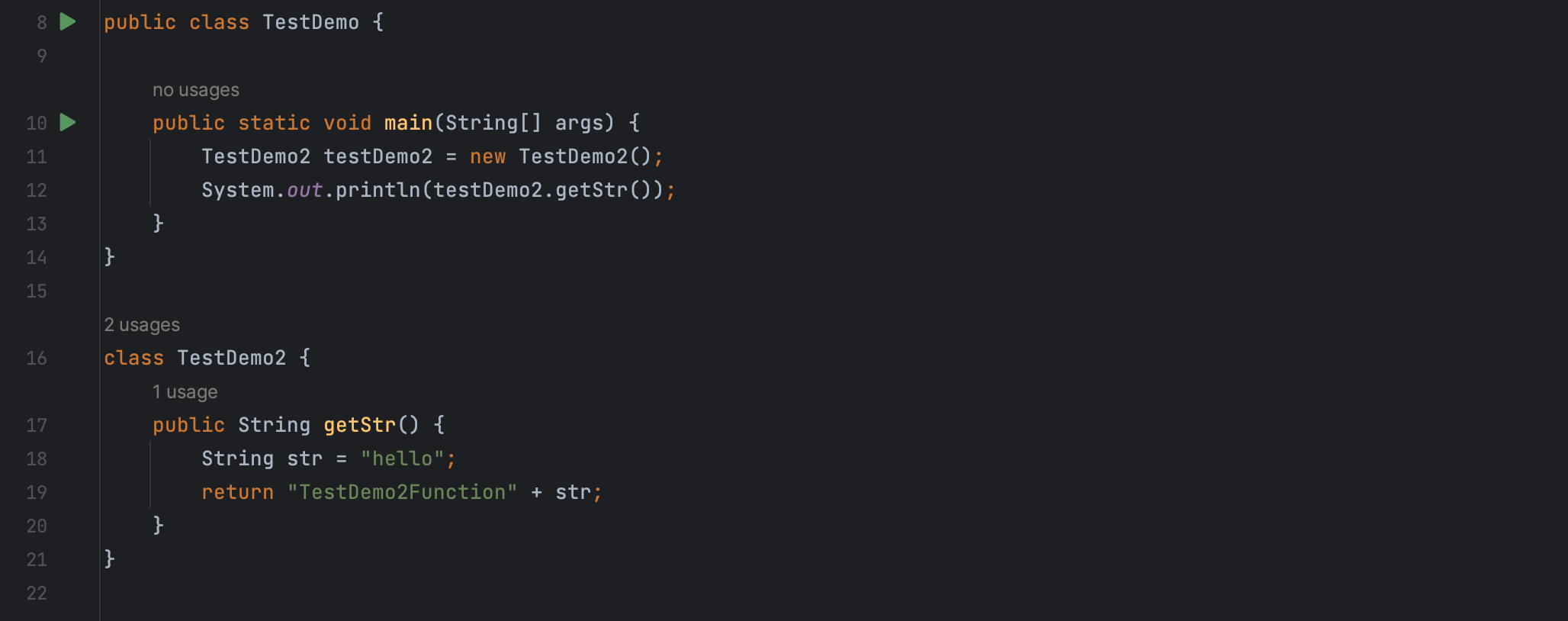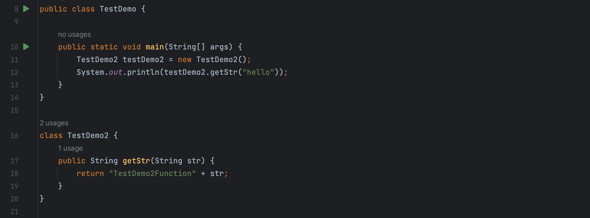 例如在 TestDemo 类的 main 方法里调用了 TestDemo2 的 getStr 方法同时打印输出。