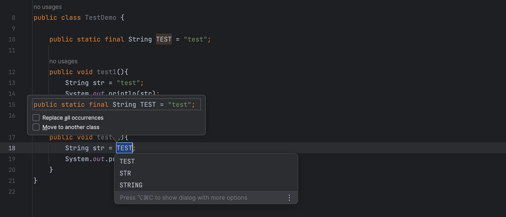IntelliJ IDEA 为提取的常量提供了合适的命名,用户可以选择使用。当类中有多处相同的常量可供提取时,IntelliJ IDEA 会给出相应的选项 Replace all occurrences 以确认是否仅对当前常量进行替换。