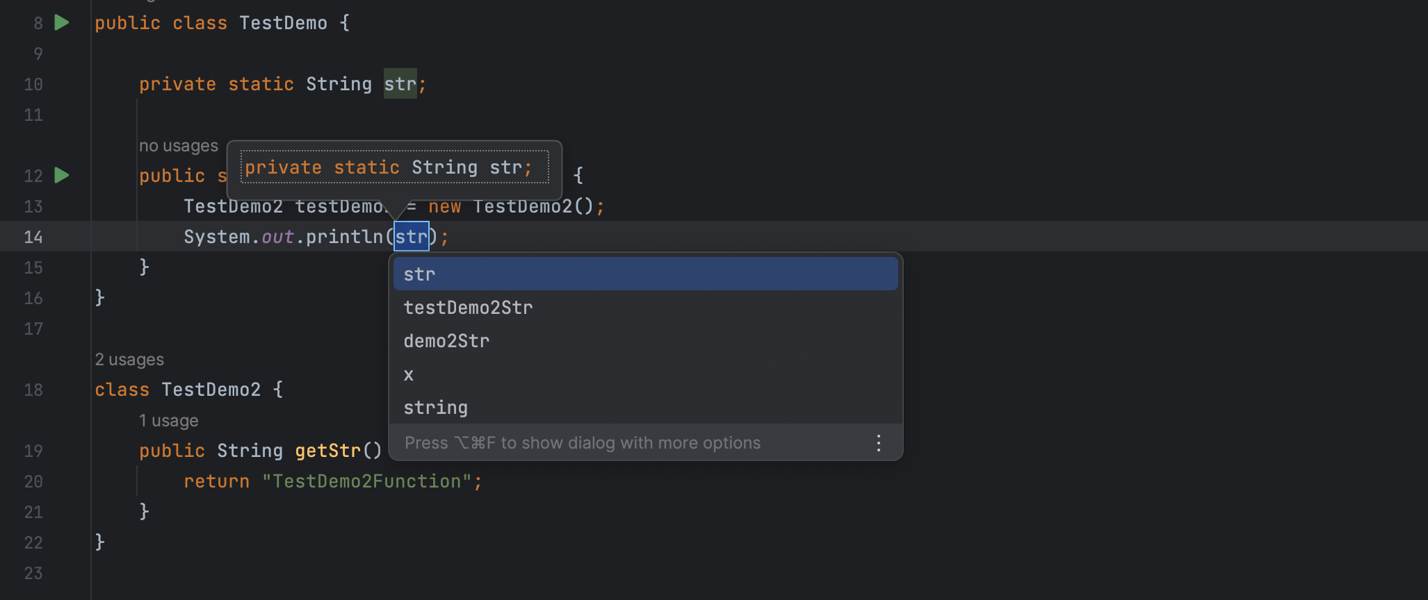 此时想将 testDemo2.getStr() 的返回值提取为字段(成员变量),就可以选中 testDemo2.getStr(),使用快捷键 Cmd + Opt + F 或从上下文菜单中选择 Refactor -> Extract -> Field 提取字段 str。