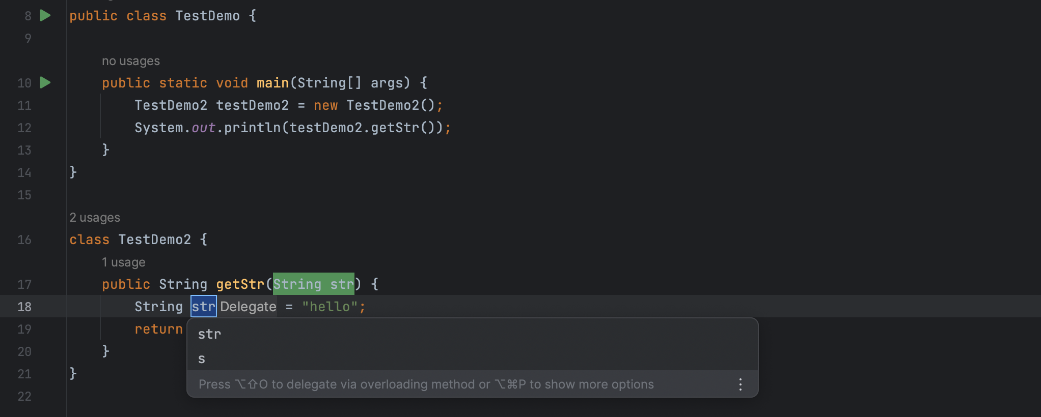 此时想将 testDemo2.getStr() 的返回值提取为局部变量,就可以选中 testDemo2.getStr(),使用快捷键 Cmd + Opt + V 或从上下文菜单中选择 Refactor -> Extract -> Variable 提取局部变量 str。