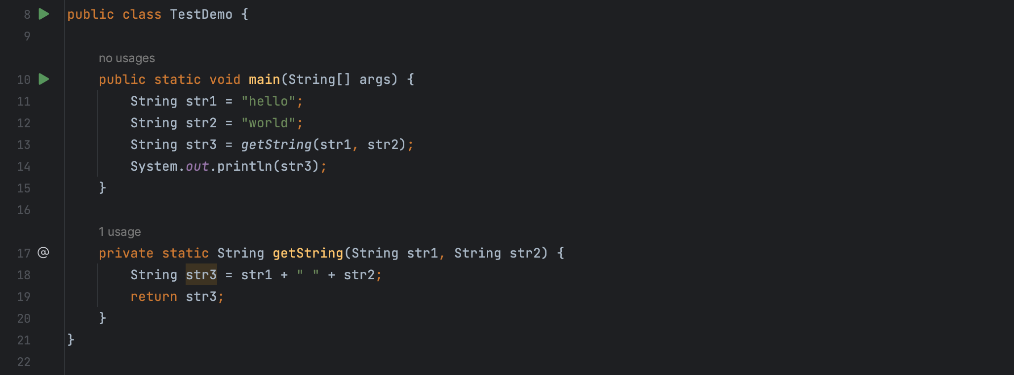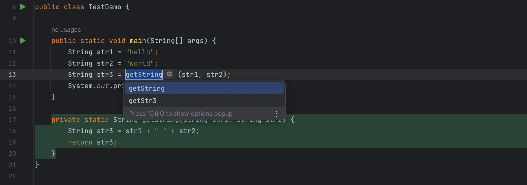 使用快捷键 Cmd + Opt + M 或从上下文菜单中选择 Refactor -> Extract -> Method 将 String str3 = str1 + " " + str2 语句提取为方法 getString。