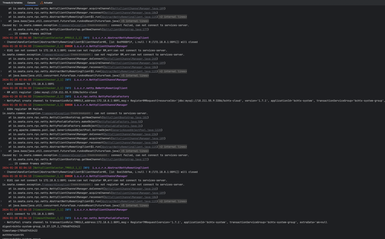在使用 Seata 时,客户端一直报无法连接服务端: