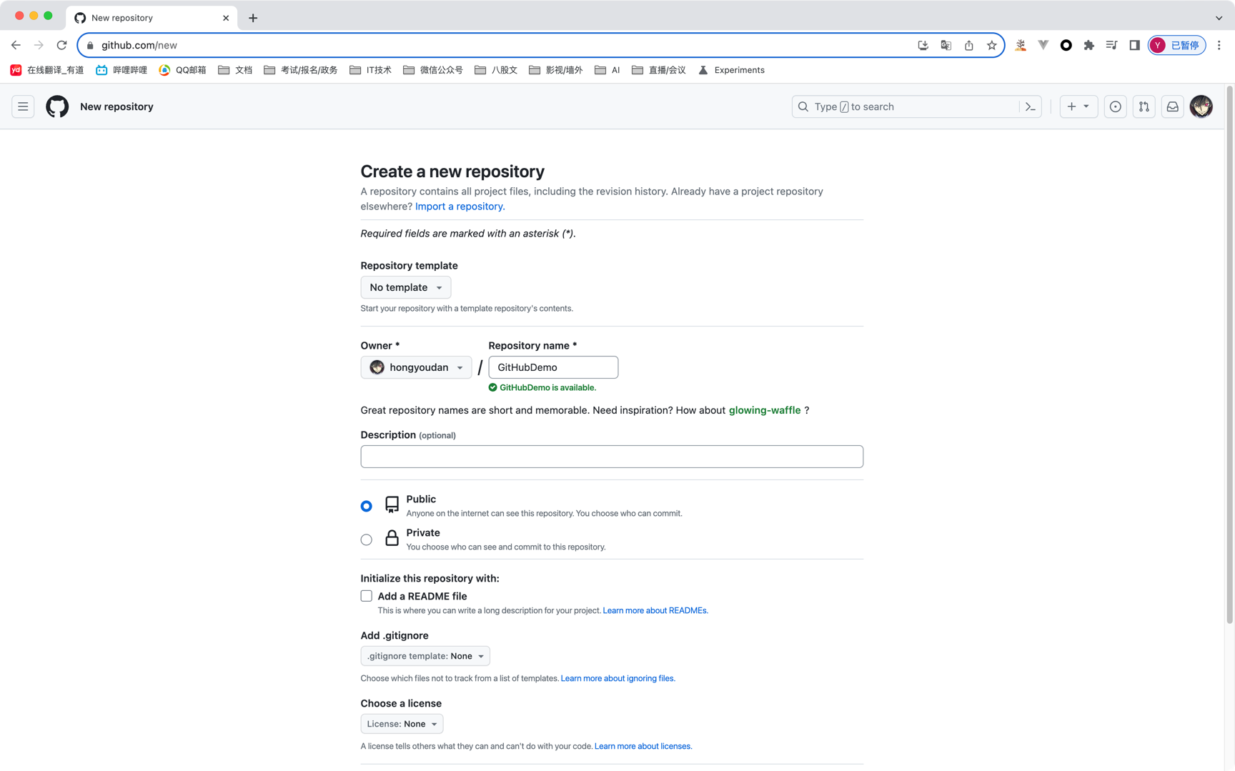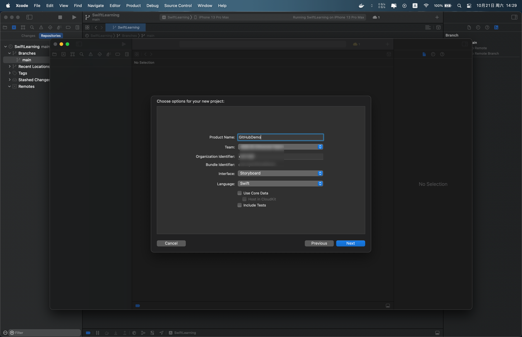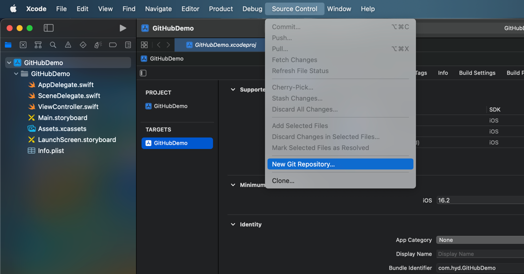 创建名为 GitHubDemo 的项目作为演示(这里没有勾选 Create Git repository on my Mac,可以在后面手动创建本地仓库)