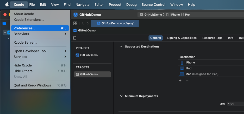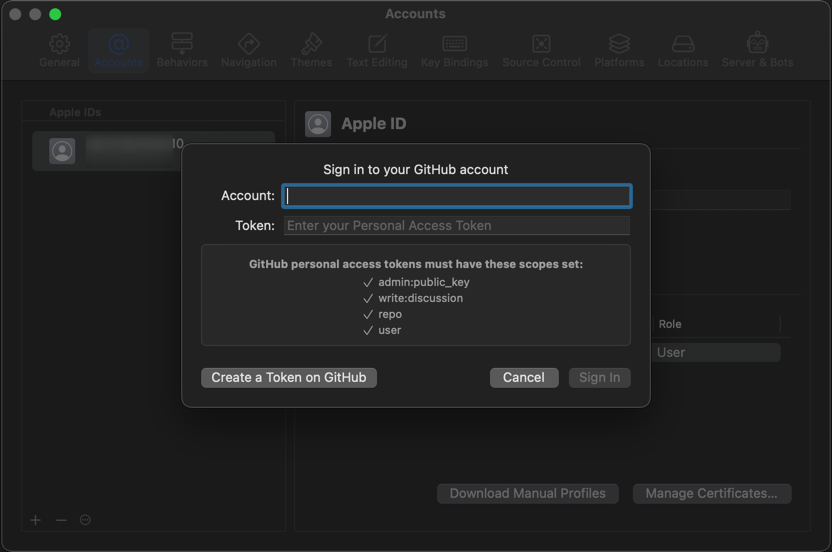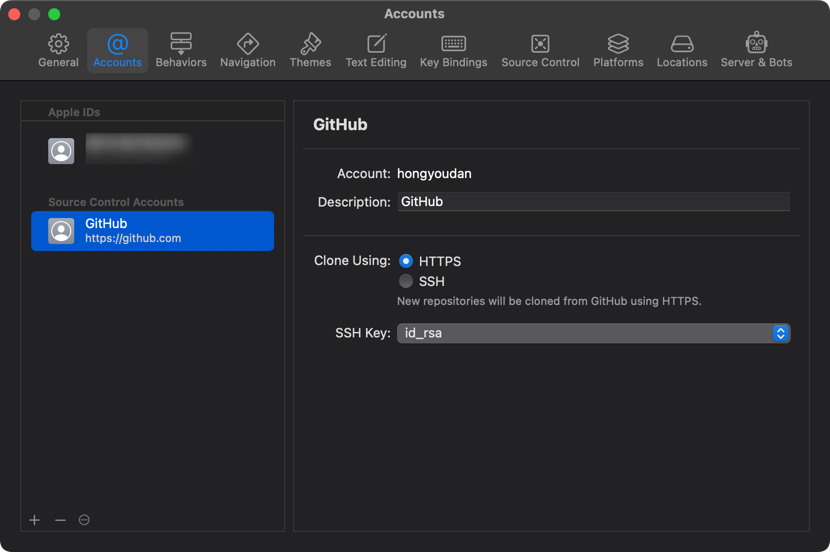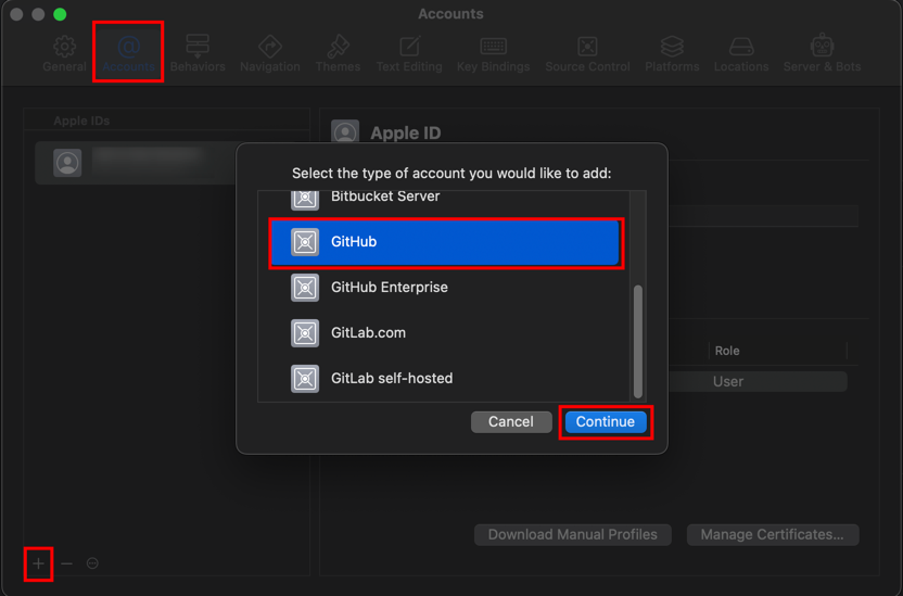 依次点击 Xcode -> Preferences -> Accounts -> + -> GitHub