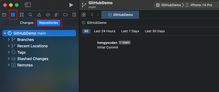 添加完成后,可以在 Xcode 的 Navigator 栏的 Show the Source Control navigator 中的 Repositories 中看到相应信息