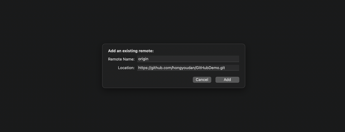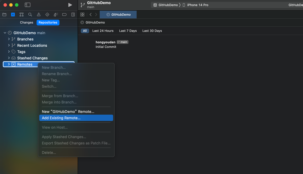 右击 Remotes,选择 Add Existing Remote,填写远端仓库地址,点击 Add