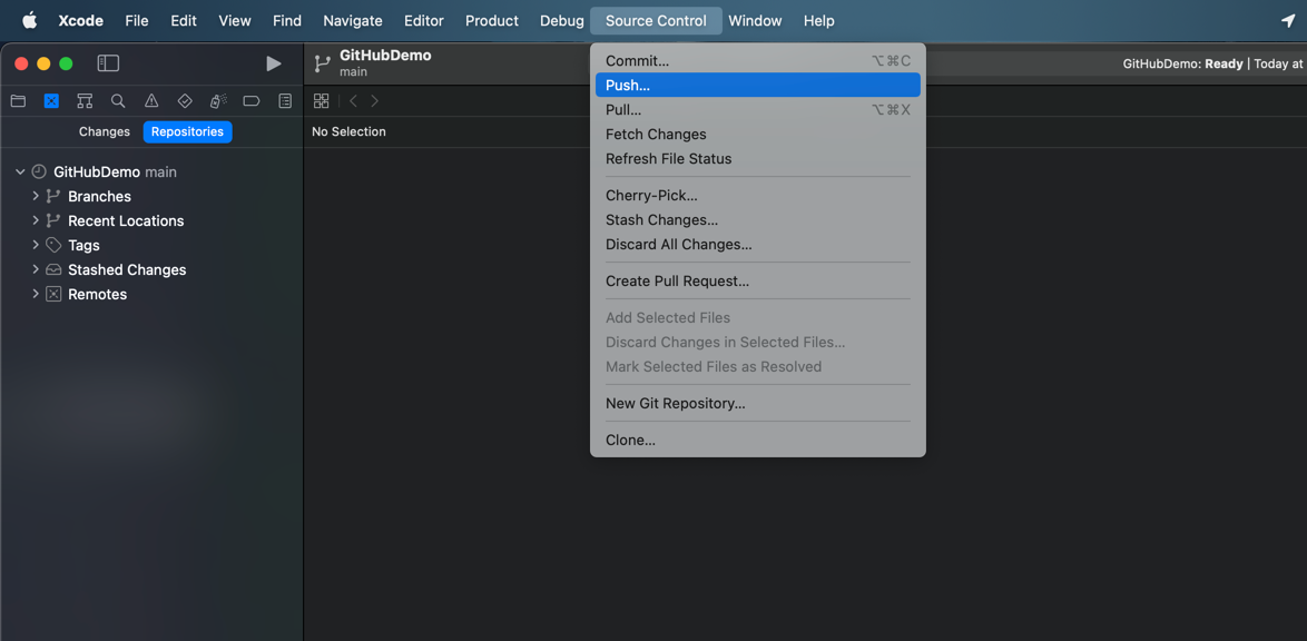 因为在 Xcode 中 Create Git repository 操作会默认 commit 一次到本地仓库,且默认 branch 名称为 main,这边没有对代码进行修改,所以直接推送代码。