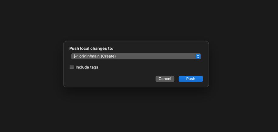 依次点击 Source Control -> Push,选择将本地的 main 分支推送到远端的 main 分支,点击 Push