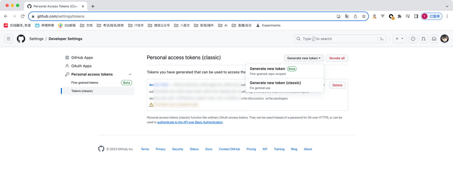 在 Xcode 中登录 GitHub 账号需要 Access Token,依次点击 Settings -> Developer Settings -> Personal access tokens -> Tokens(classic) -> Generate new token -> Generate new token (classic)