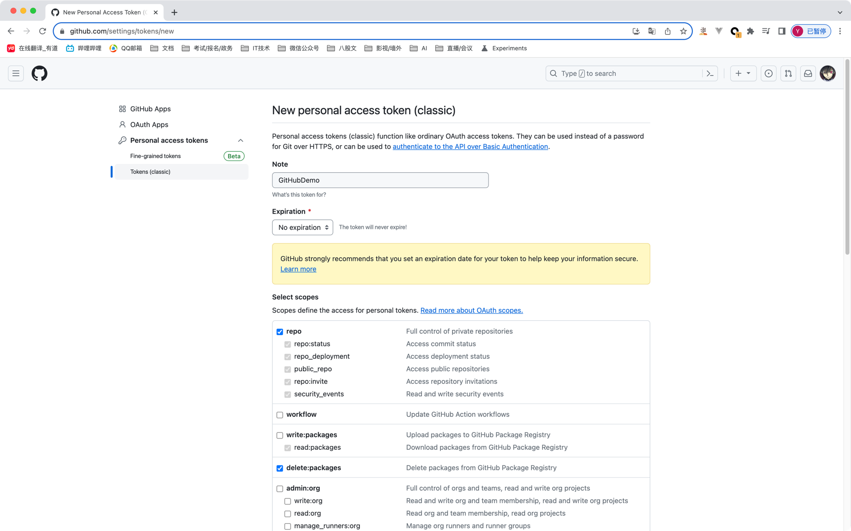 依次填写 Node(用途)、选择 Expiration(过期时间)、选择 Scopes(权限),并点击生成