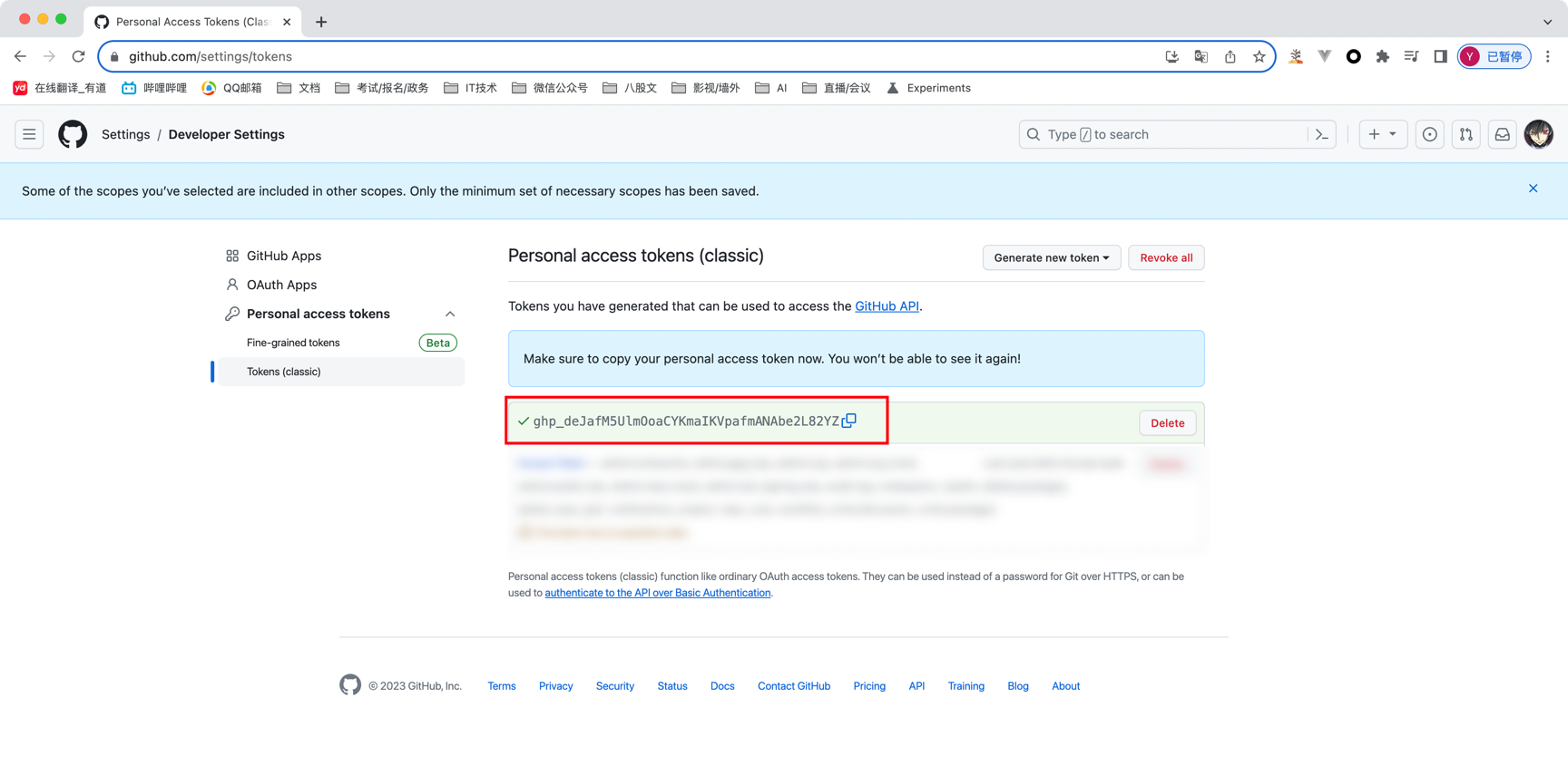 复制并保存生成的 Access Token,这个 Token 只会显示一次,如果忘记了,需要重新生成