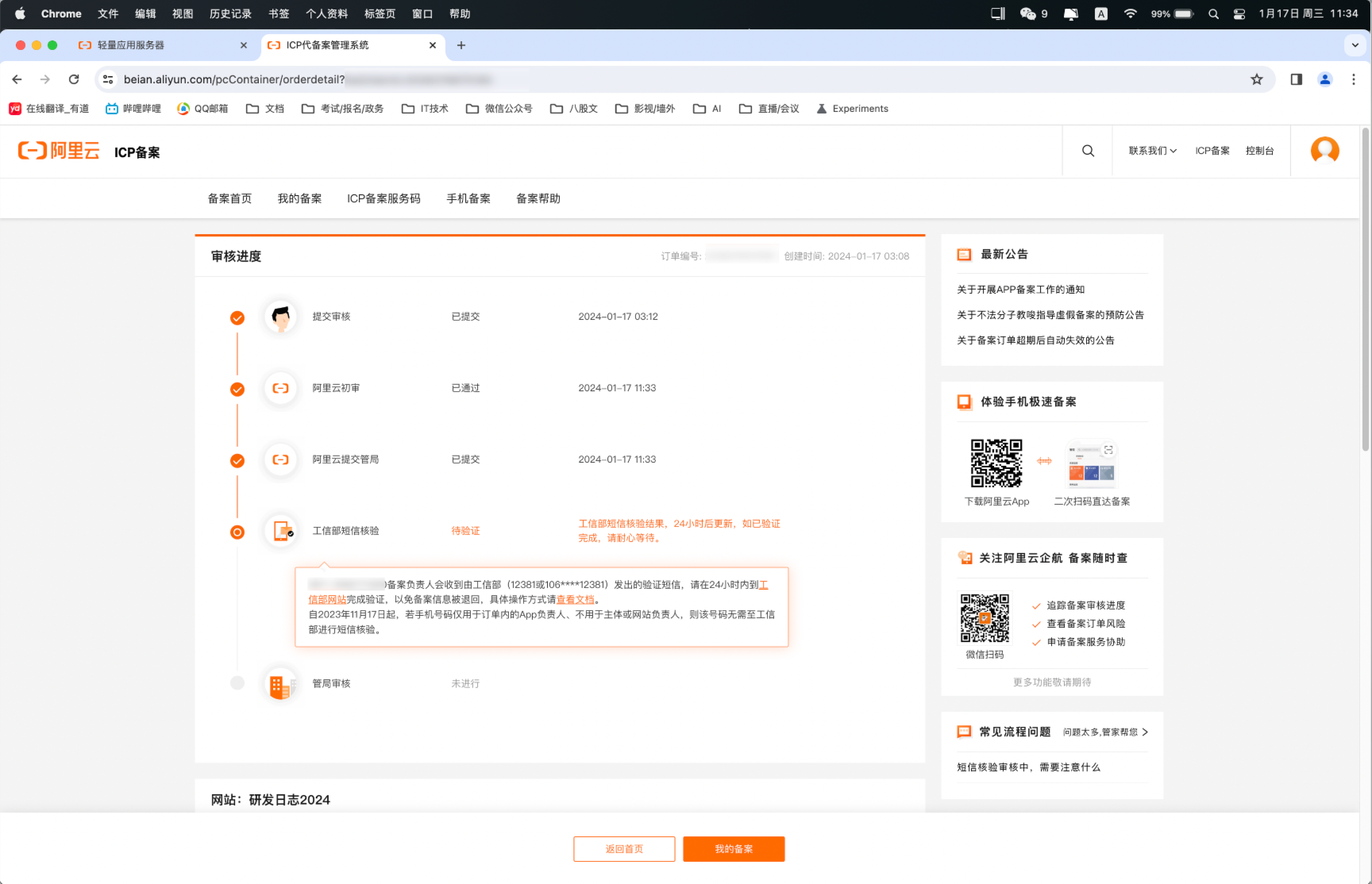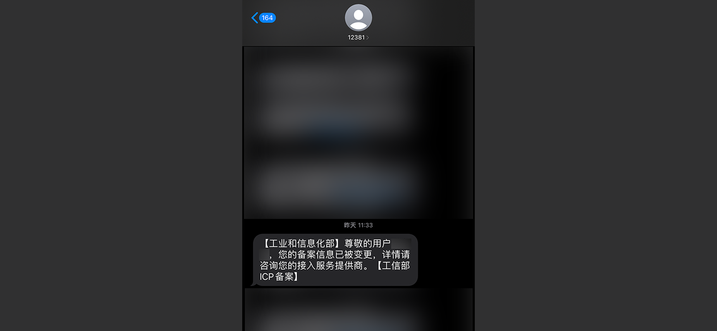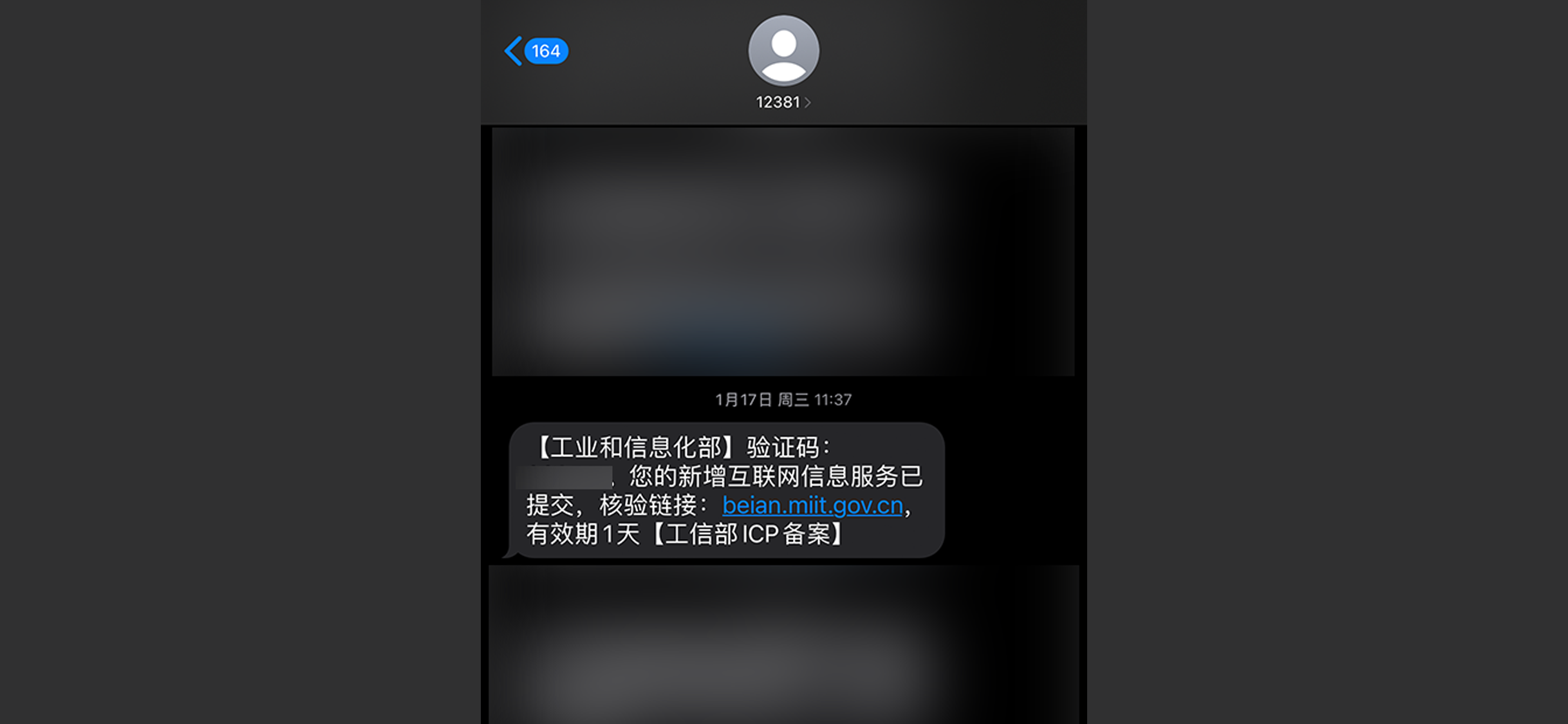 在此期间(一般是当天内),备案负责人会收到由工信部(12381 或 106****12381)发出的验证短信,请在 24 小时内到工信部网站完成验证,以免备案信息被退回。