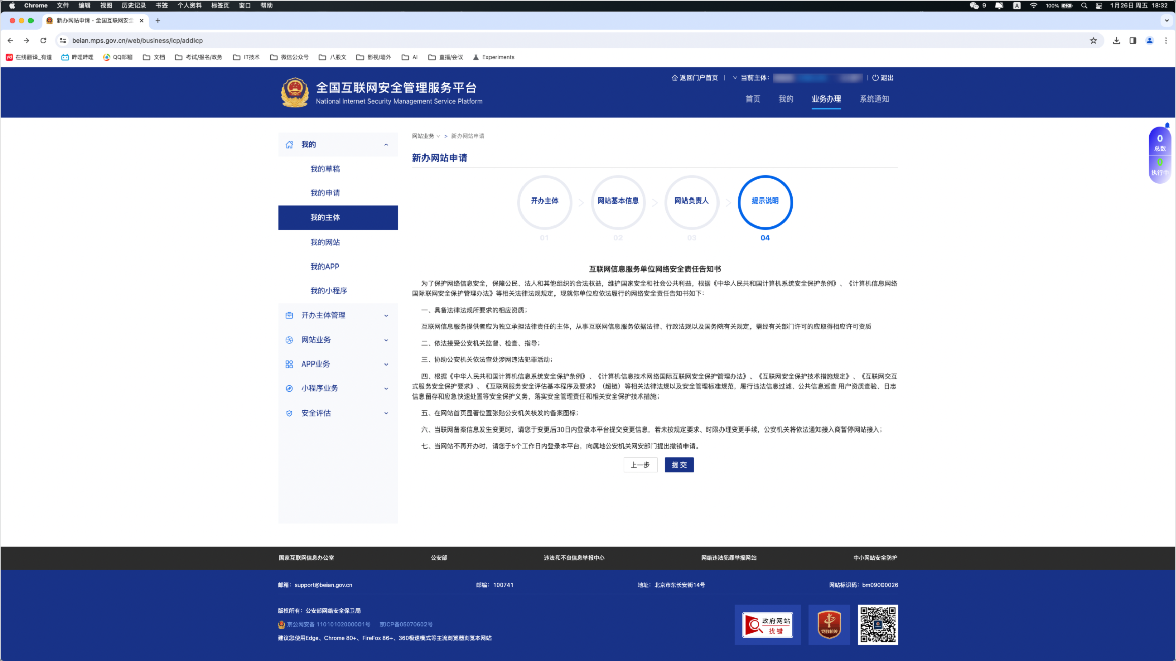 在提交 ICP 备案申请订单前,请您在此步骤中仔细确认您的主体、网站/App、接入等备案信息是否正确,确认无误后提交备案订单。