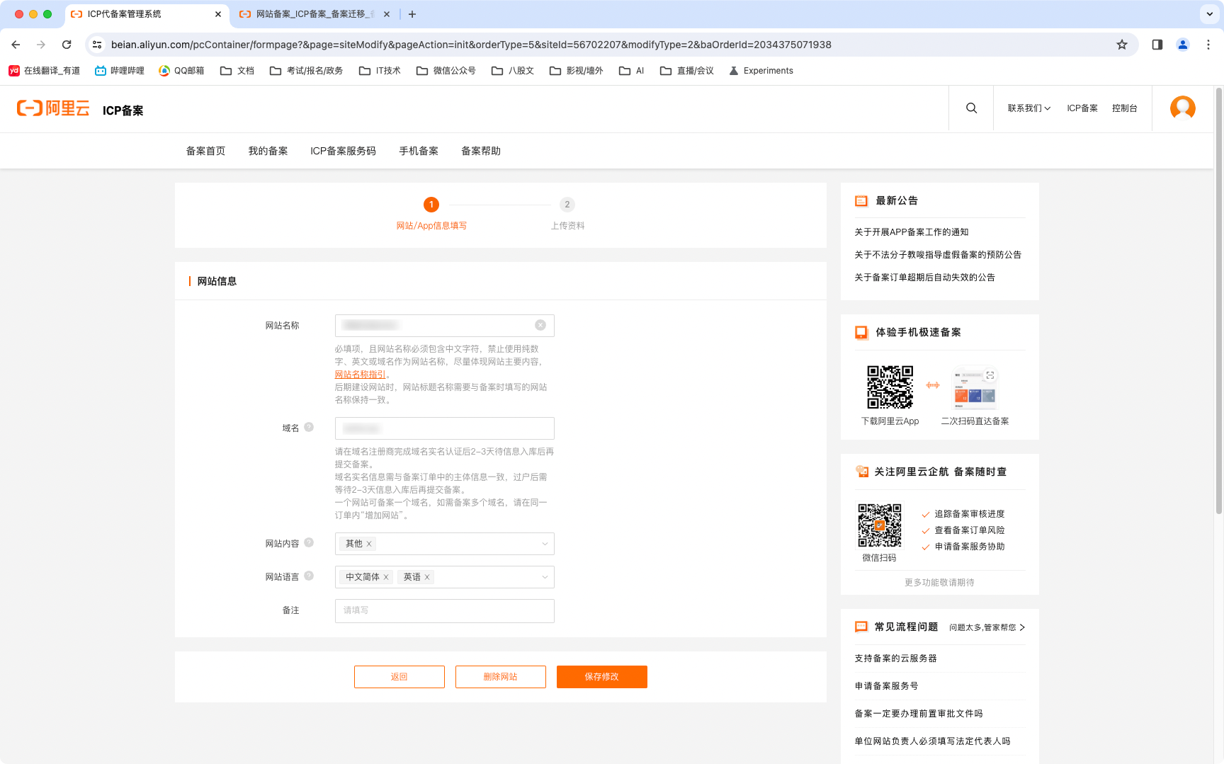 - 填写网站或 App 信息(网站信息在电脑端或者阿里云App端均可填写,App 信息仅支持电脑端填写):