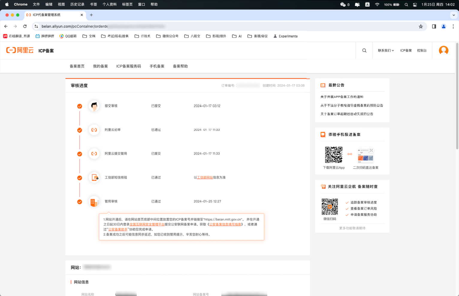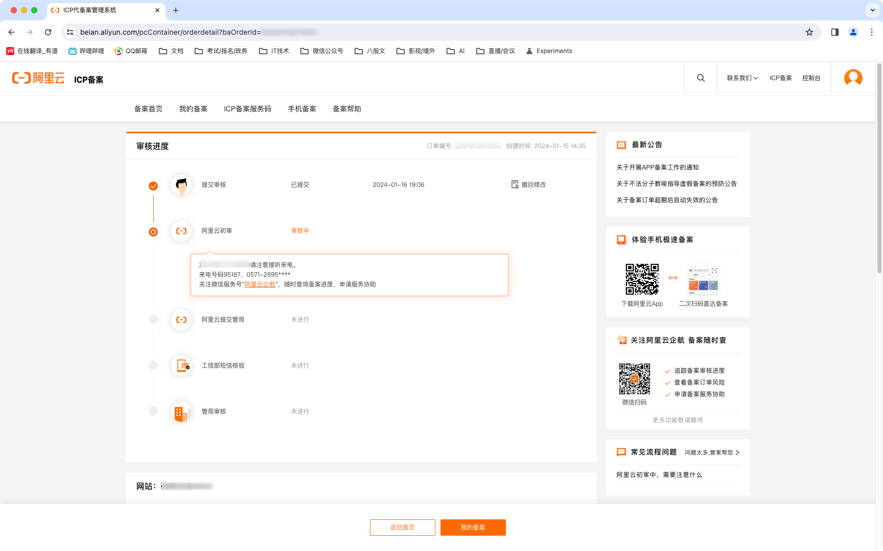 提交订单后,阿里云客服会在 1 个工作日内完成初审(一般是在早上打电话询问、核对订单内相关内容),审核通过后,提交给管局审核。